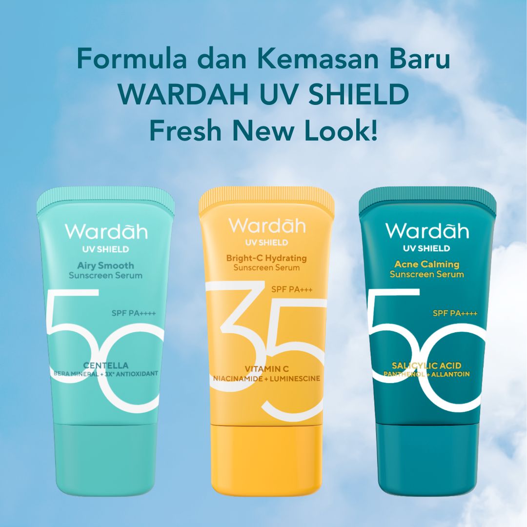 Beauties, tiga sunscreen Wardah UV Shield kesayangan kamu kini hadir dengan kemasan baru yang lebih fresh dan bentuknya super gemas! Ada varian UV Shield Bright-C Hydrating, Airy Smooth, dan Acne Calming.